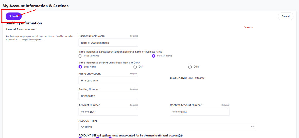 7. Account type (NOTE: Merchants may only use a Checking Account. If any concerns, reach out to direct leadership.)