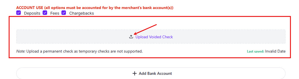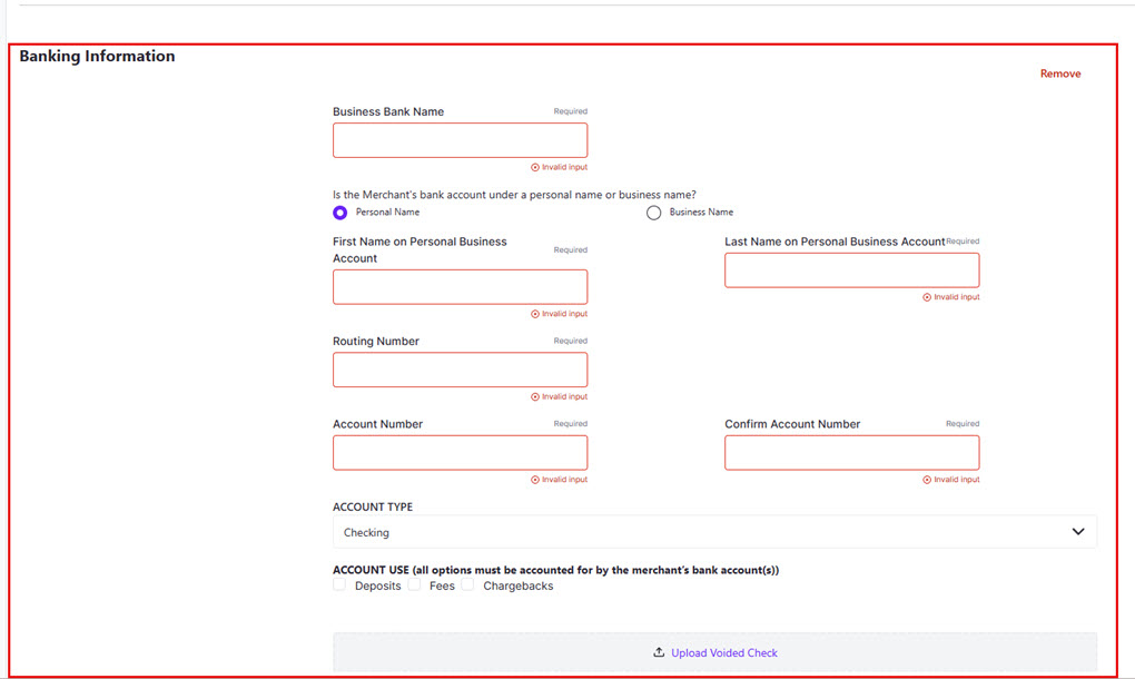Note: If the routing number does not match a valid banking institution, a red line will appear around the box, and the form will not submit. The system will attempt to match the account to a known valid account through our verification system. If no match can be made, a red error box will appear at the bottom of the screen, and a voided check will need to be uploaded.