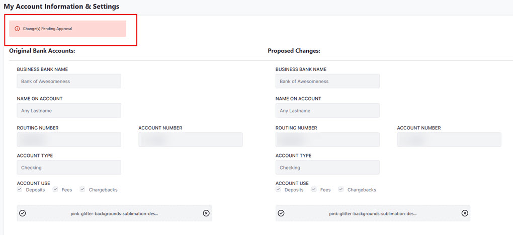 6. Once the form is successfully submitted, a red box stating Changes Pending Approval will appear along with the Proposed Changes