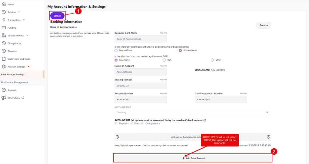 3. On the ‘My Account Information & Settings’ screen, select ‘Edit All’ and then select ‘+ Add Bank Account’ at the bottom of the screen.
